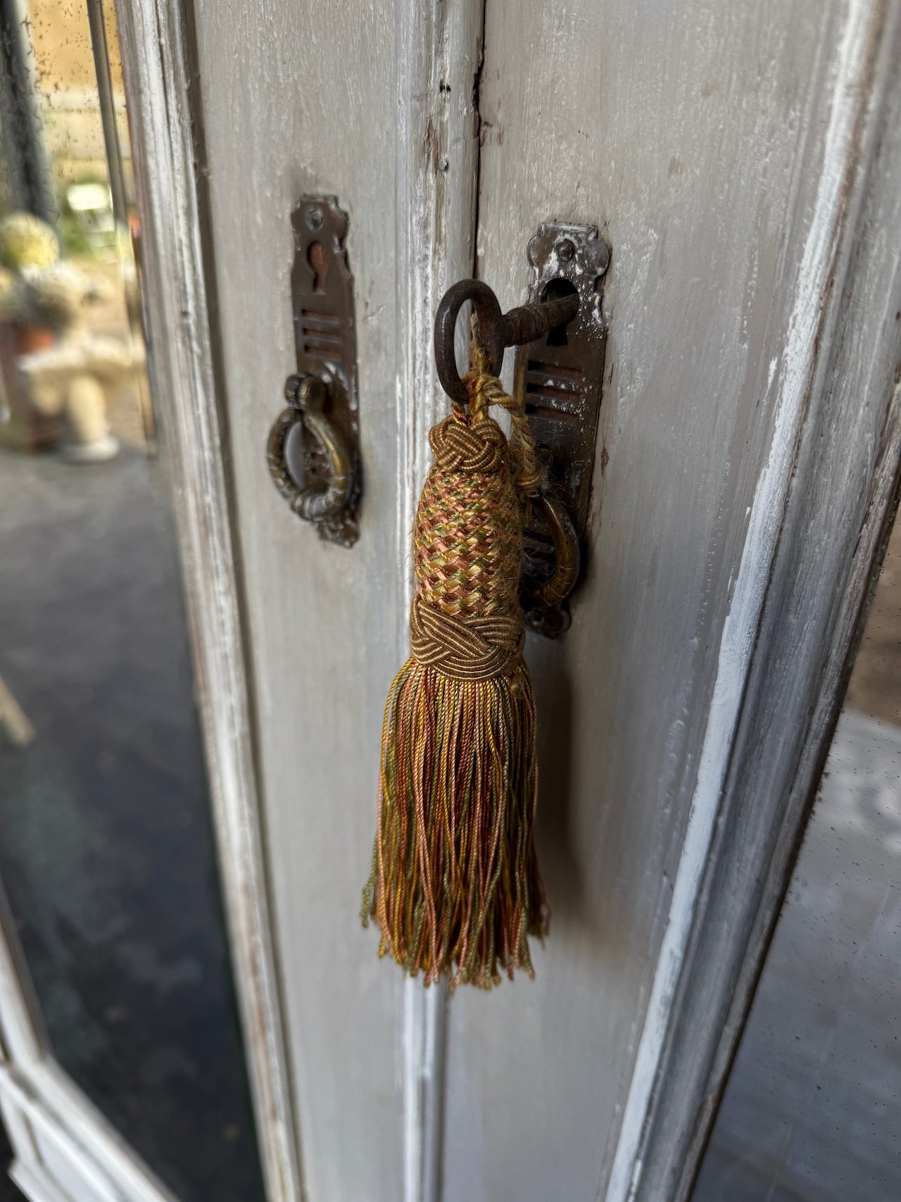 Gorgeous antique French Louis XV armoire. Painted in a lovely taupe / grey with white detailing. Rustic natural wood interior with shelf and metal pole. Gorgeous top decorative carving. Lovely mirrored doors with foxed glass as shown. Handy bottom drawer. Breaks down for easy transportation. Very easy to assemble. Not deep enough for adult hangers.