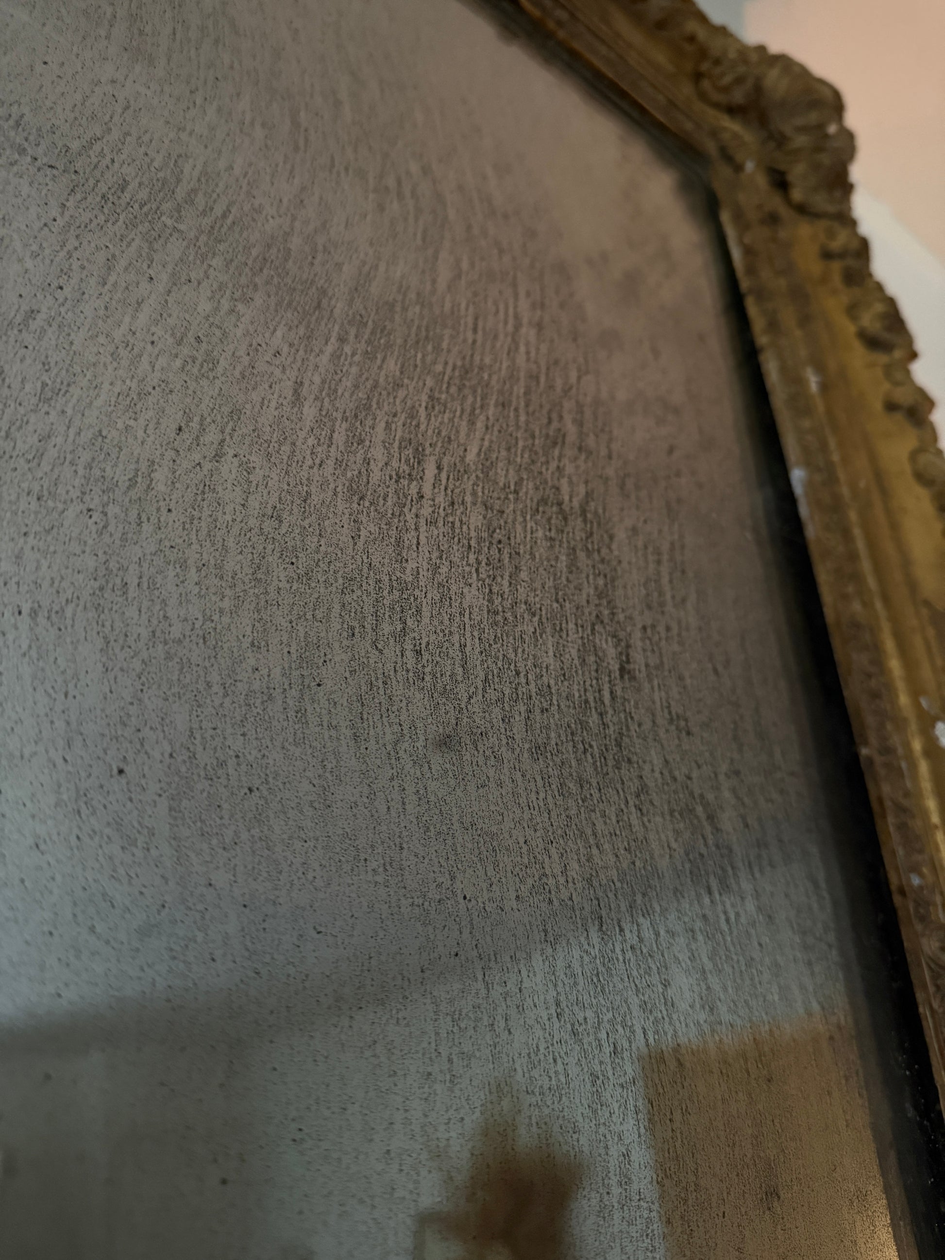 Fabulous French foxed mirror. Timeworn gilt frame. Beautiful mercury glass. General wear and tear in keeping with it's age.