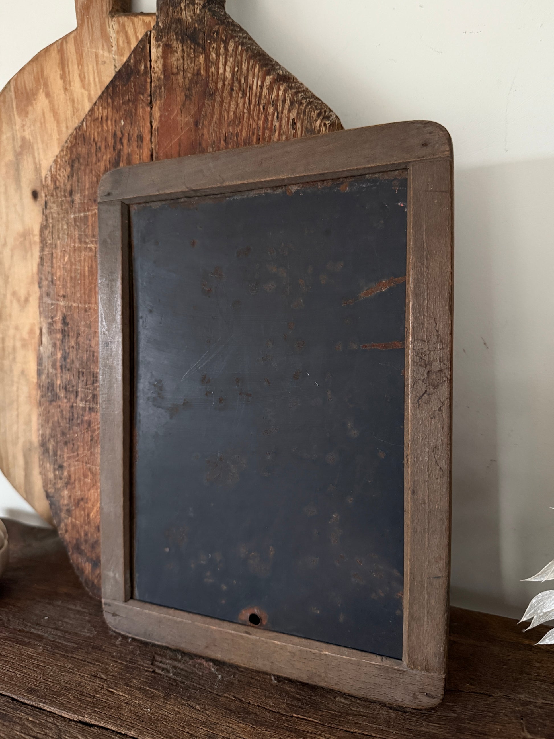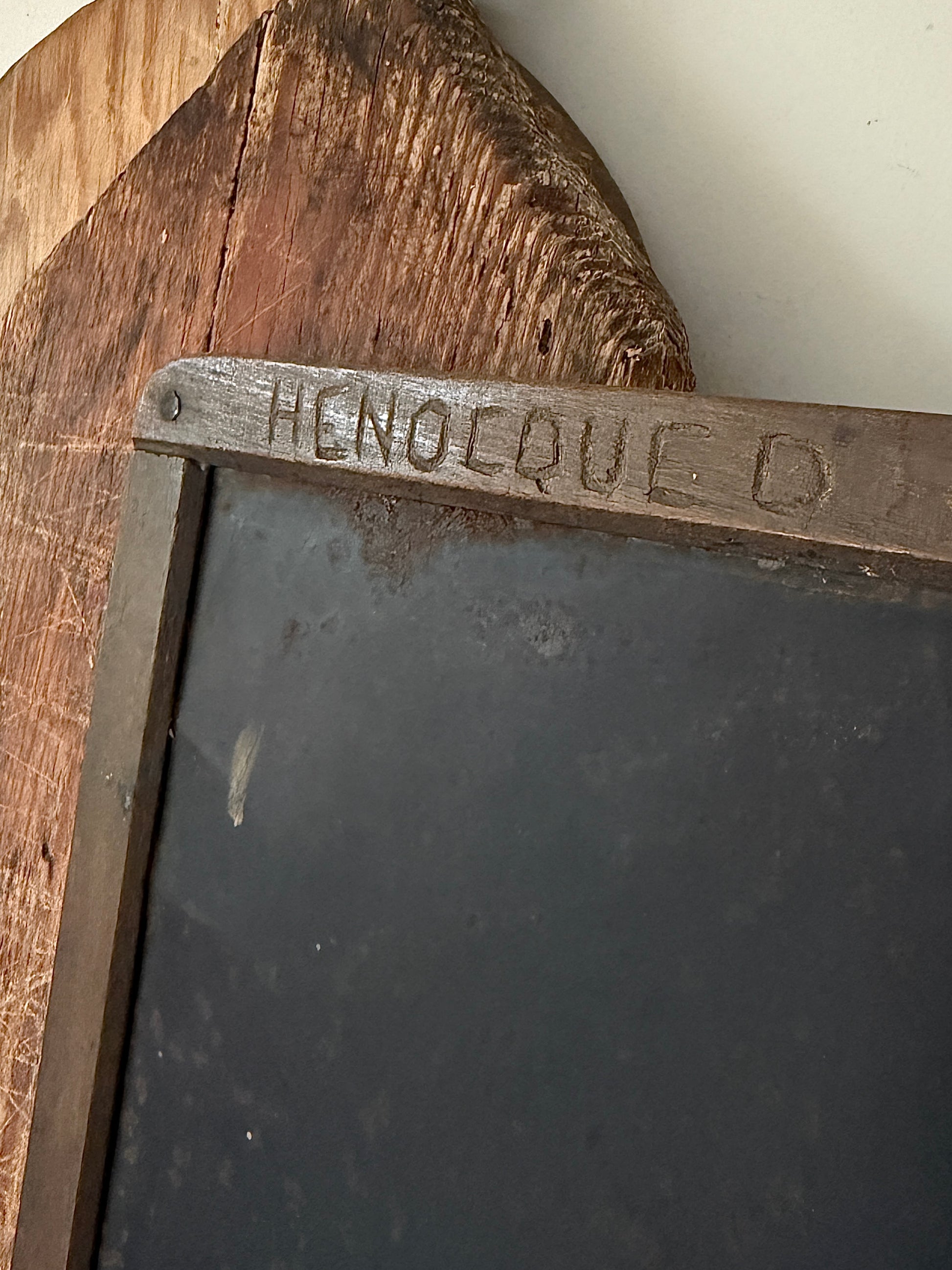 Fabulous vintage French chalkboard. Rustic board and frame. Inscribed with the name Henocque D. Double sided. A lovely memo board.