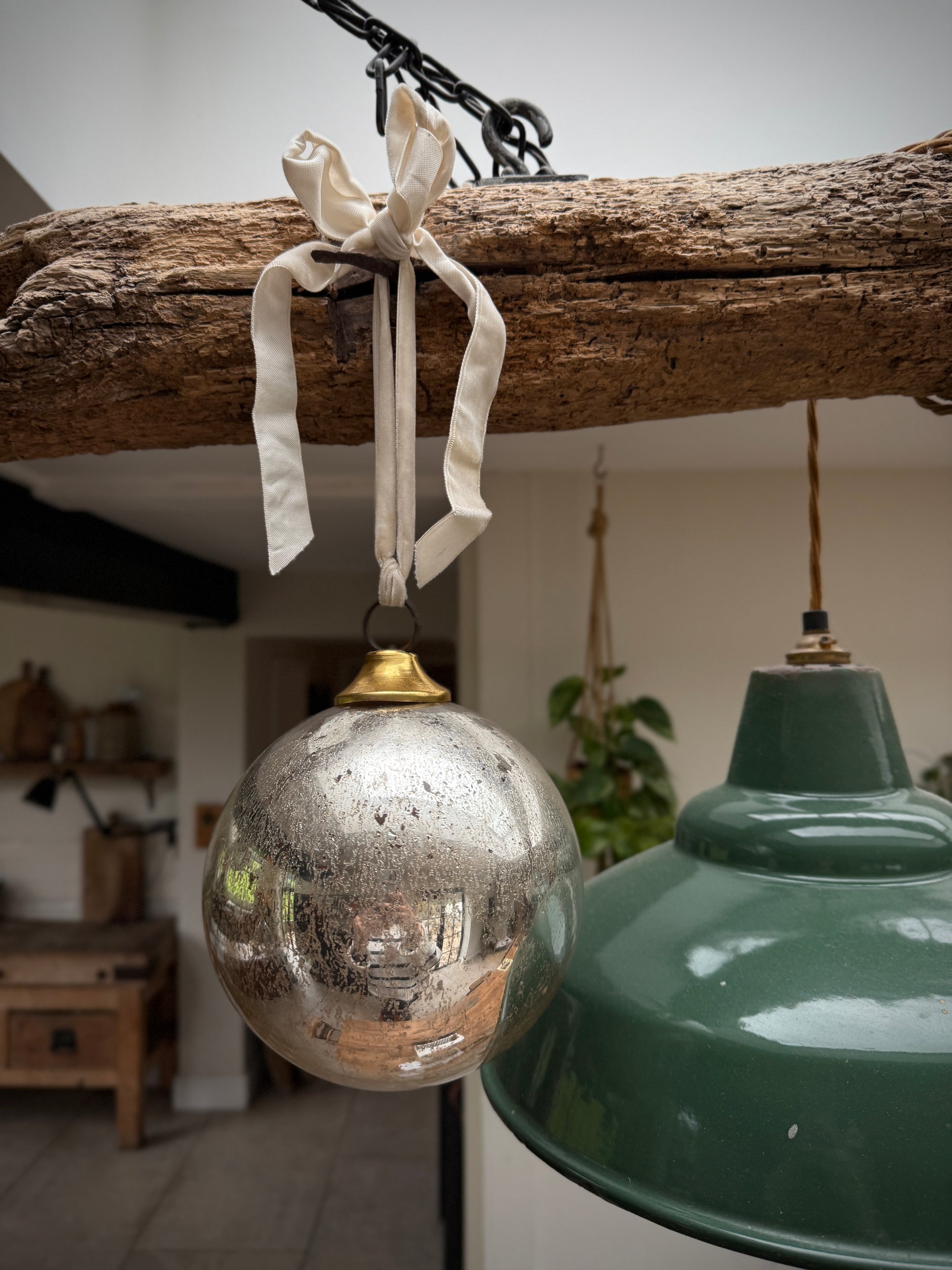 Gorgeous giant vintage bauble. Beautiful mercury glass. Cream velvet ribbon.