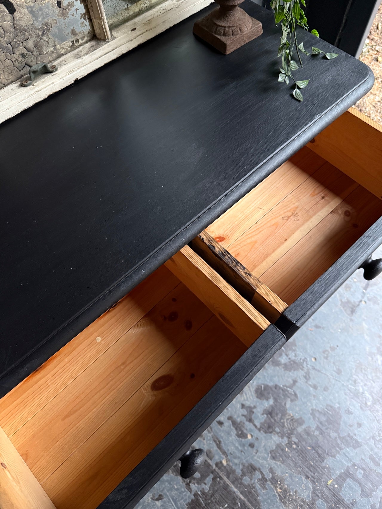 Lovely old pine chest of drawers. Handpainted in Annie Sloan's Athenian black then waxed to seal. Nice detailing around the drawers. Bun feet.