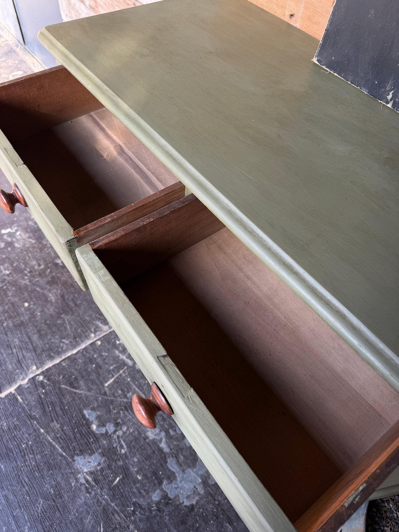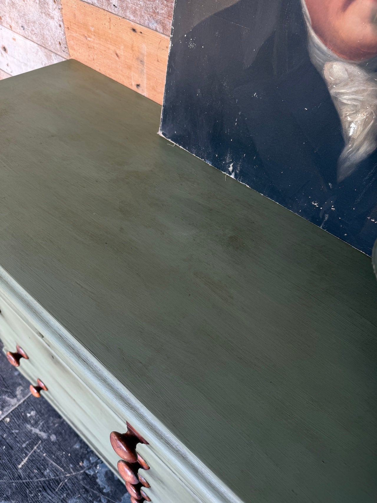 Lovely handpainted Victorian chest of drawers. Turned wood knobs. Painted in Annie Sloan's Olive chalkpaint then waxed to seal. General wear and tear.