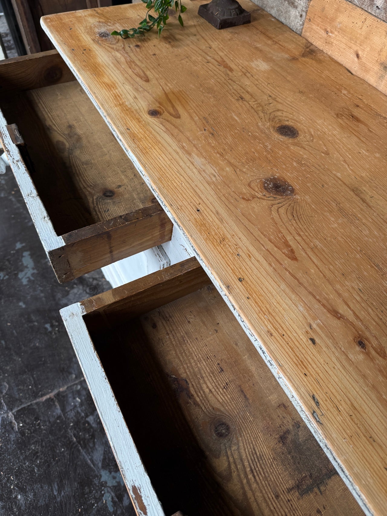 Absolutely lovely big, solid French sideboard. Original off white distressed paint with stripped pine top. Panelled doors, with working lock and key. Two handy drawers. Rustic interior. General wear and tear in keeping with it's age. A really lovely piece. Can be painted in a colour of your choice for an extra £100.