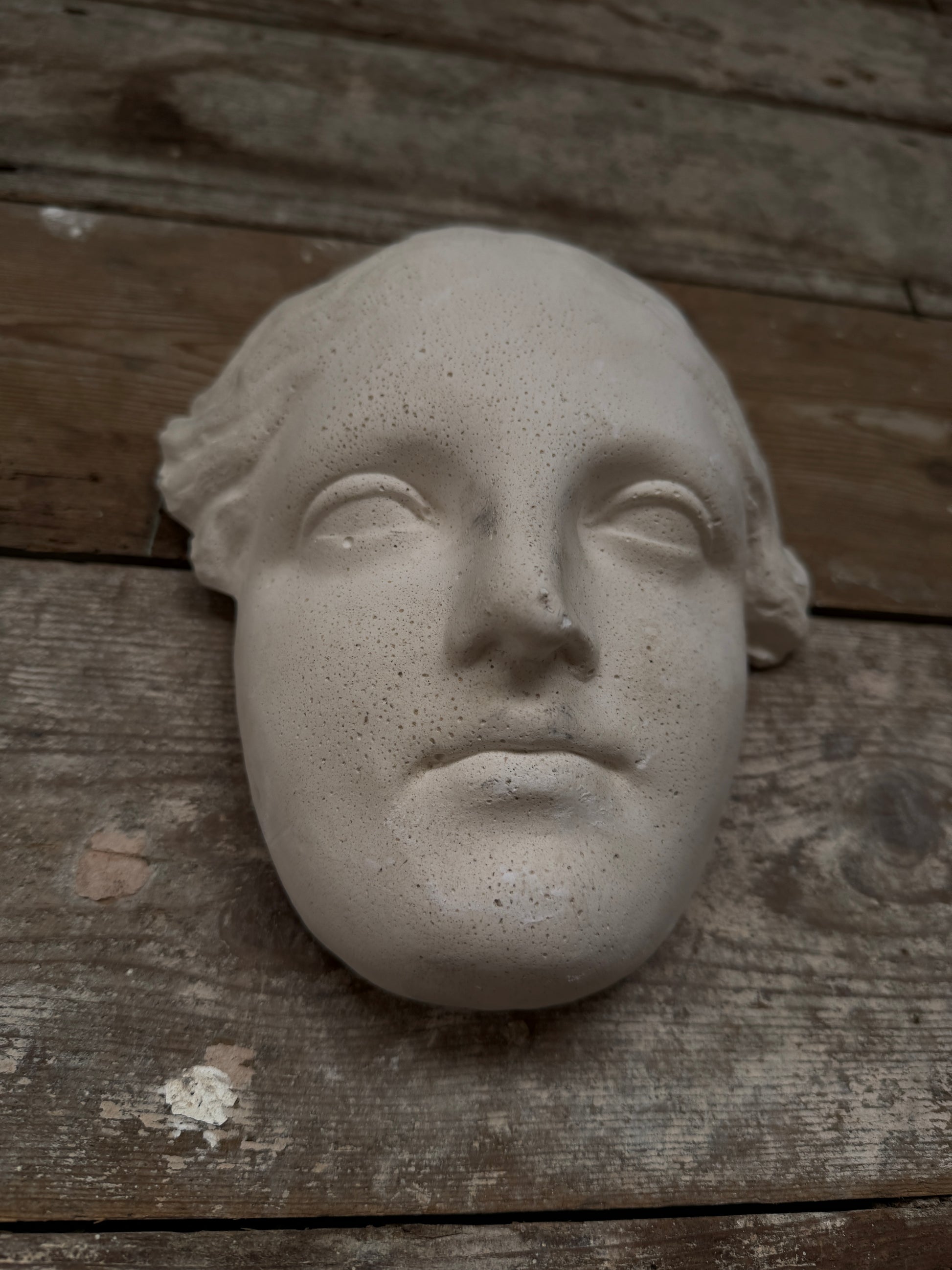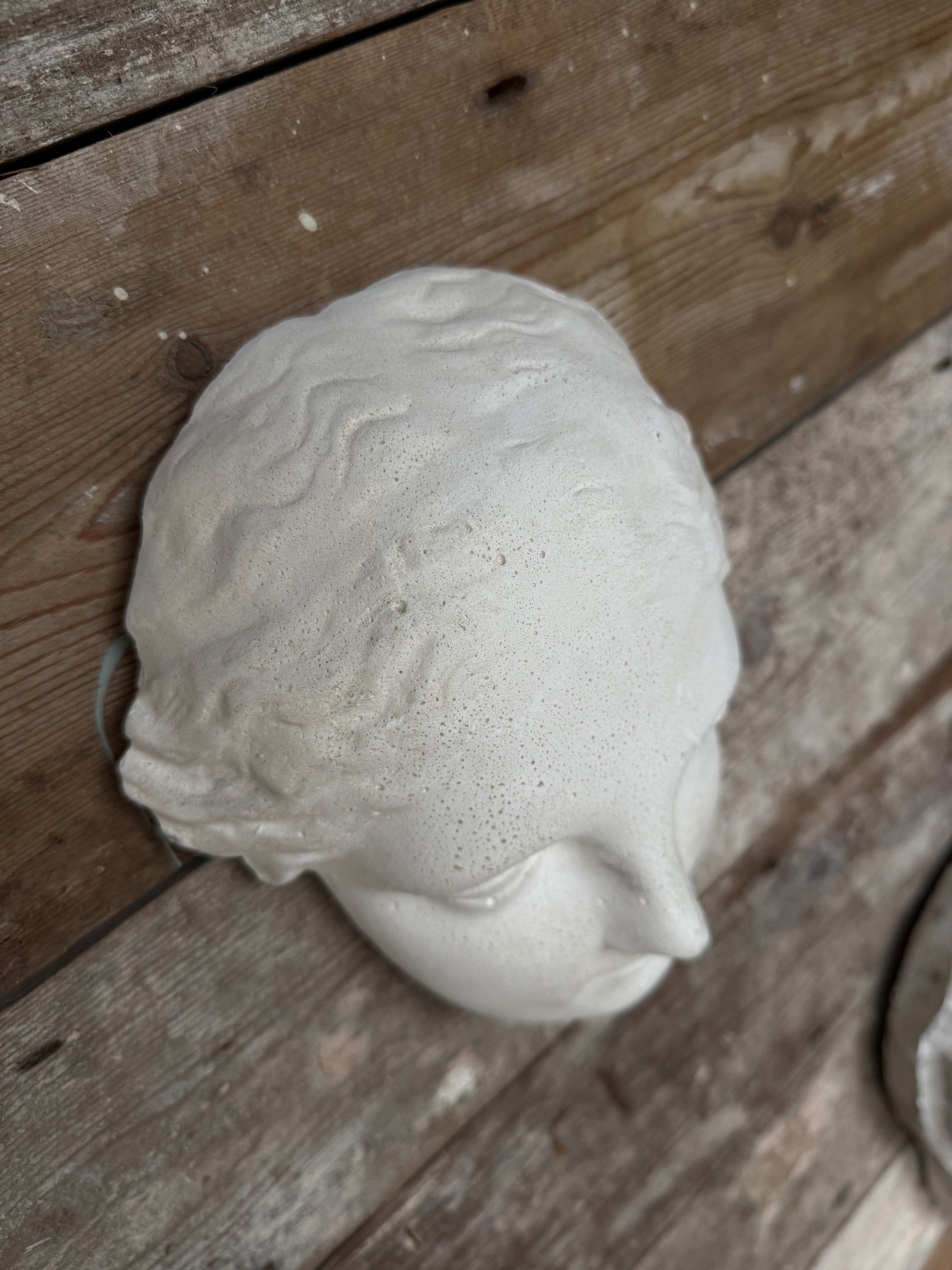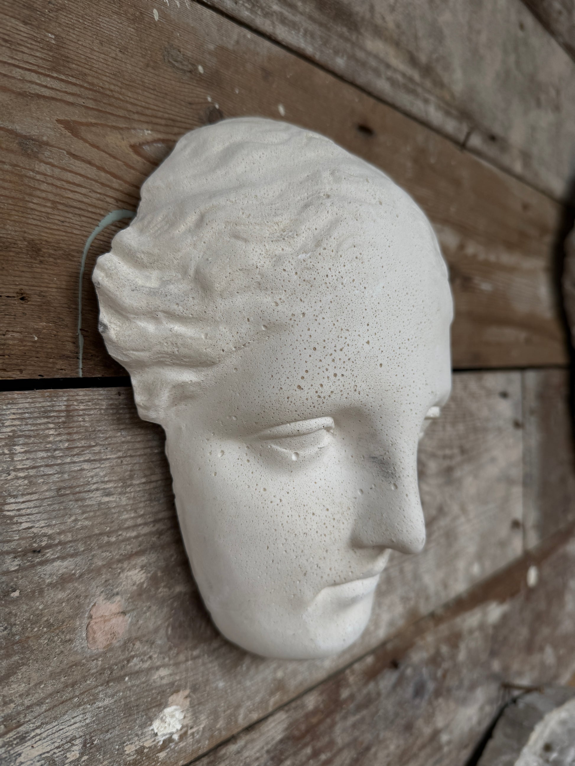Plaster cast of a classical sculpture face, probably Niobe, a figure from Greek mythology. Wall mounted.