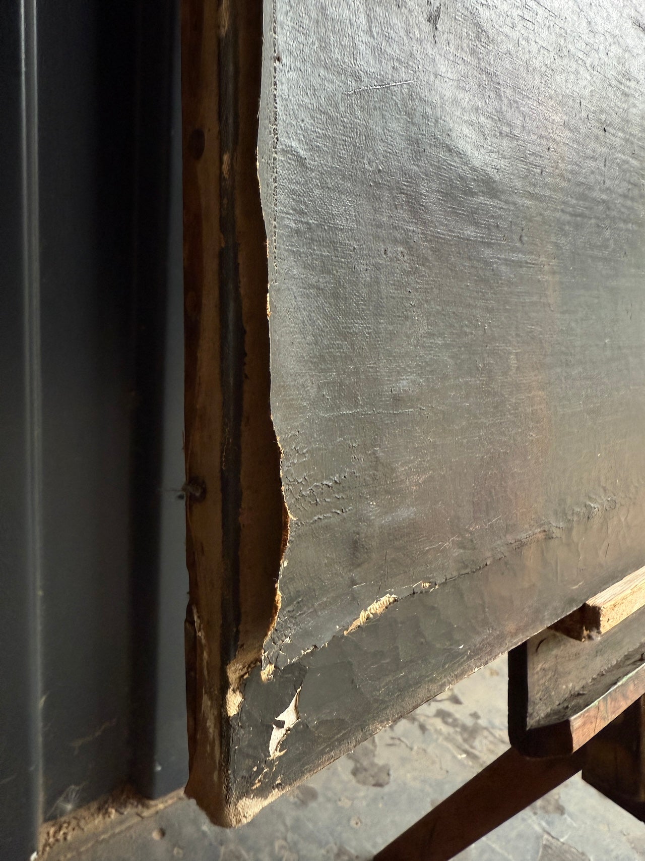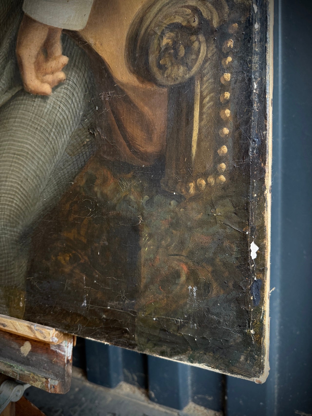 Lovely big antique oil on canvas of a sitting gentleman. Unframed. General wear and tear as shown.