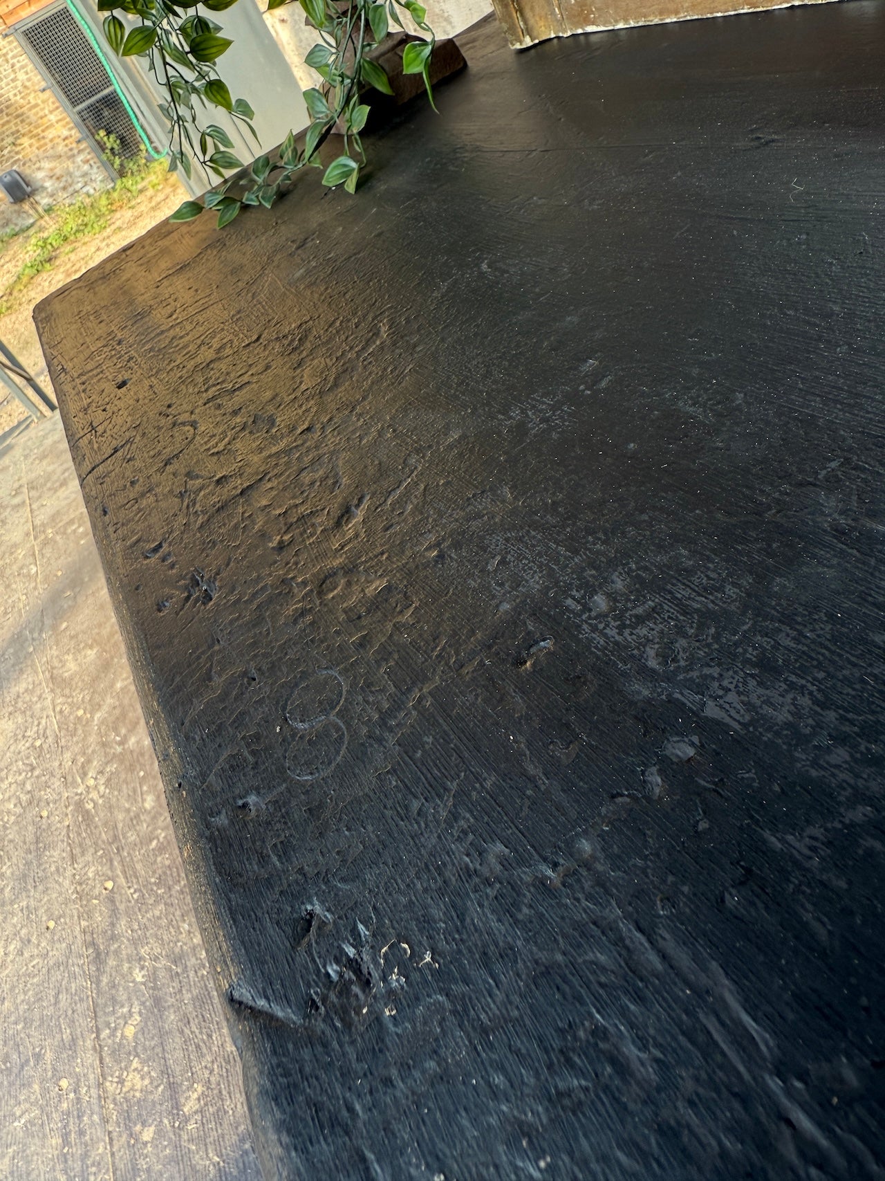 Superb rustic old English sideboard. Off black paint with beautiful gold ivy leaf detailing. Lovely carvings. Textured, rustic top. Aged interior. Top storage drawer. A really lovely, unusual piece.