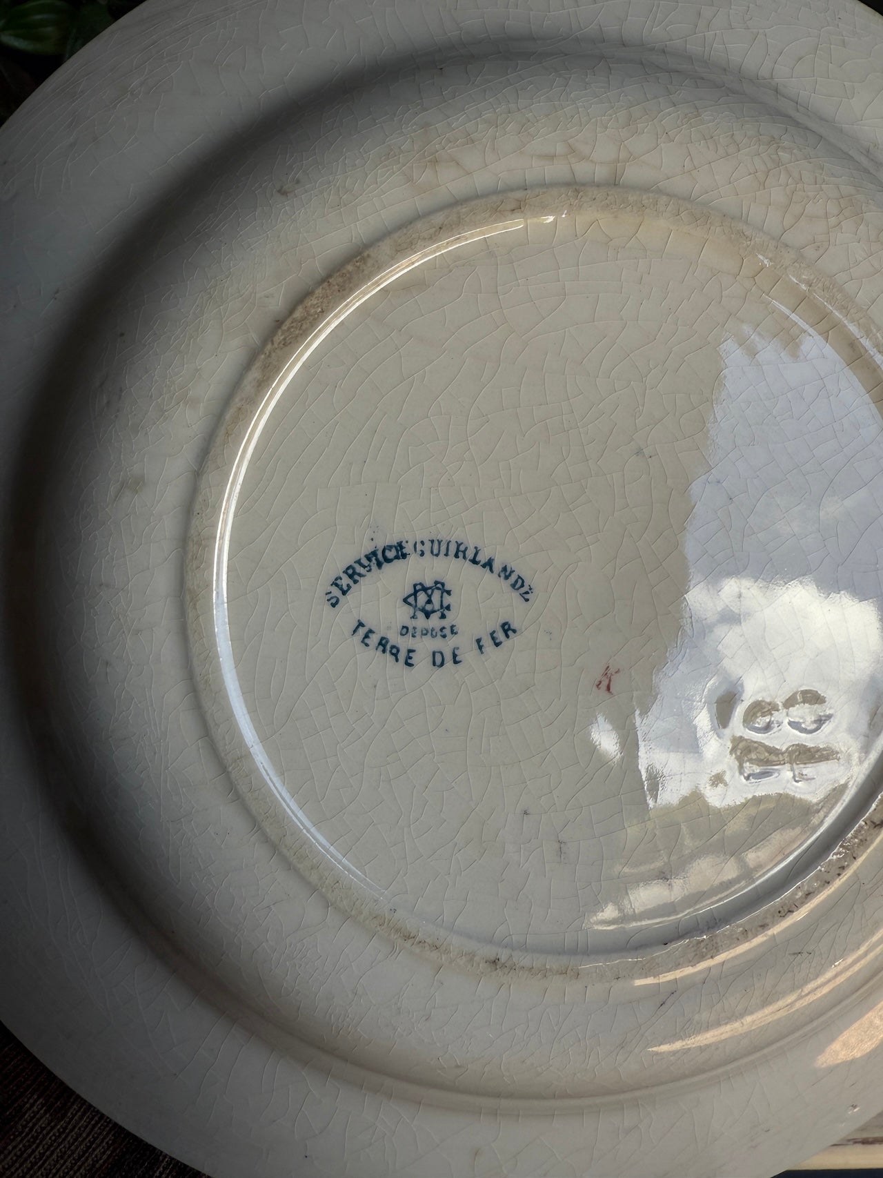 4 x gorgeous vintage French shallow bowls / soup plates. Ideal for use or simply for decoration. Pretty detailing. Stamped Service Guirlande - Terre de Fer. Slight variation in colour - two are a little darker than the others. Ideal for starters or pasta.