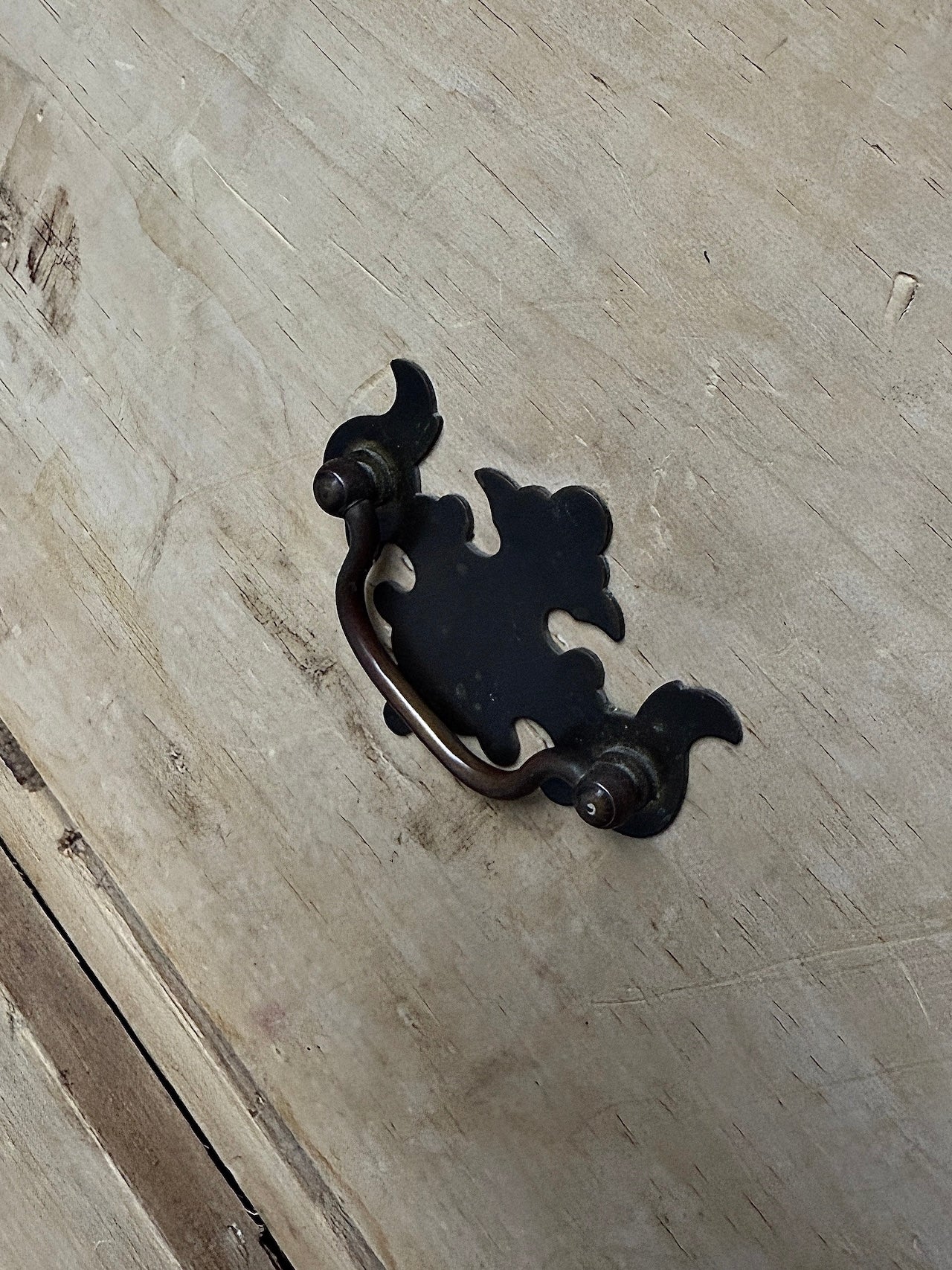 Handsome, slim little vintage pine wardrobe / cloaks cupboard. Panelled central door. Metal poles and hooks internally. Nice deep drawer. Not deep enough for adult hangers to sit comfortably so ideal as a child's wardrobe or occasional cloaks cupboard.